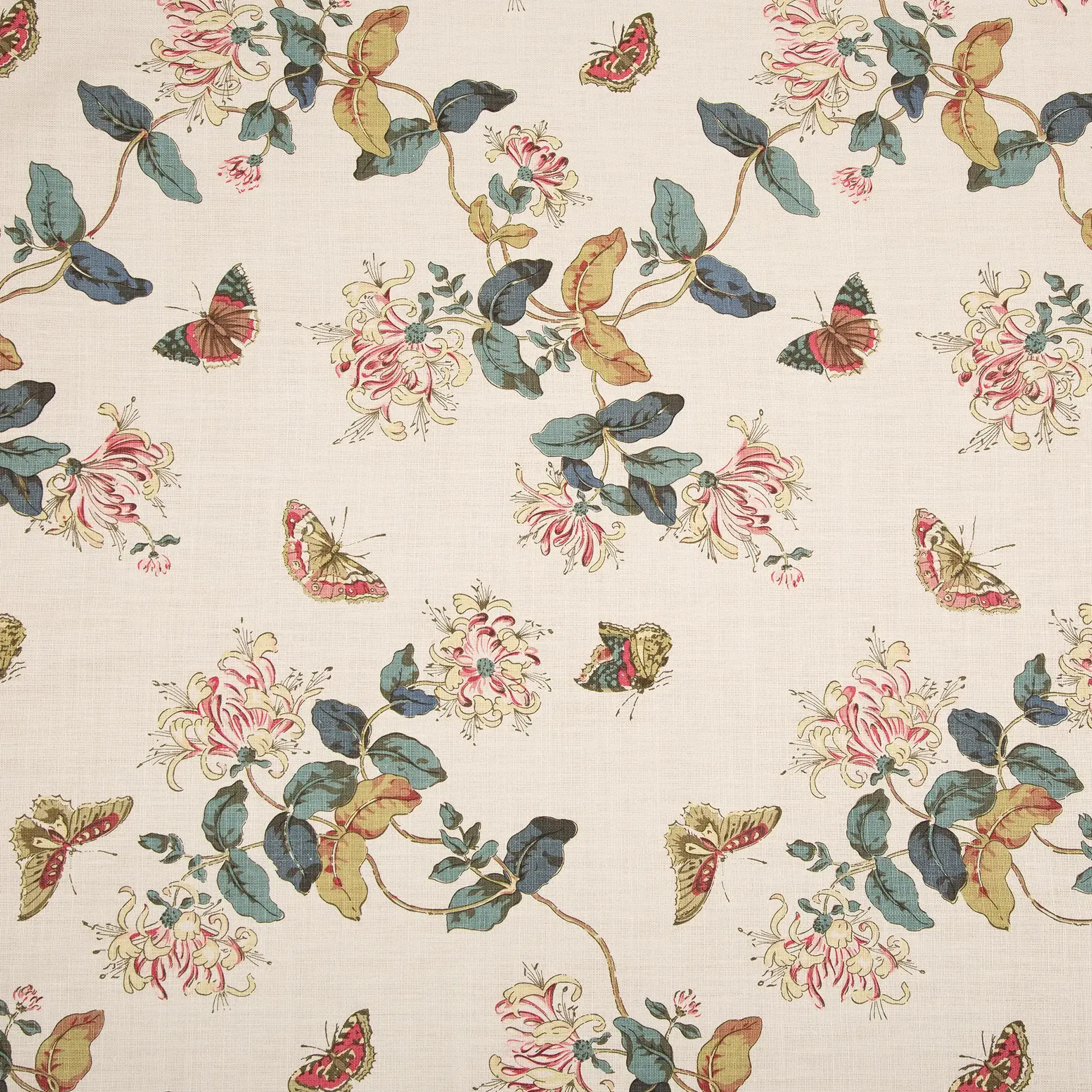 Drived from an English block print from the 1840’s, this trailing design of honeysuckle and butterflies has been part of the collection since the 1970’s